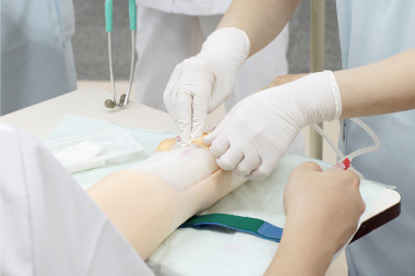 透析スタッフは、豊富な経験に基づいて作成されたマニュアルを用いて実習し、全員が統一された手技をもって患者さまに関われるようになるための基礎をこの研修で作ります。