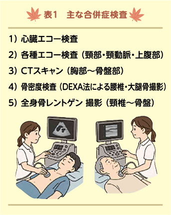 善仁会グループでは、患者さまに痛みなどの負担がほとんどない検査を行っています。右に主な合併症検査を示します(表1)。