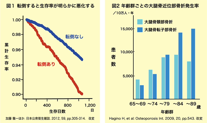 皆さまの中で、今まで転んだことのない人はいらっしゃいますでしょうか? 恐らくいらっしゃらないでしょう。転んだときに打ちどころが悪かった場合、残念ですが「骨折」になってしまうことがあります。でも、ほとんどの場合は打撲などで済んでいたと思います。しかし65歳以上の高齢者ではいったん骨折すると、図1のように骨折をした場合、明らかに生存率が下がり、3年後までに死亡率が倍増することがみてとれます。