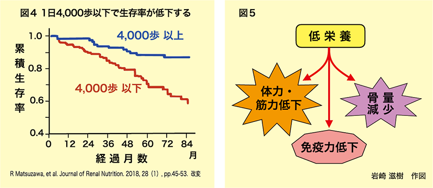 言うまでもないことですが、運動により筋力低下を防ぎ、骨折後の回復を助けることができ、実際、図4のように毎日4,000歩以上の運動で生存率が上昇することがわかっています。