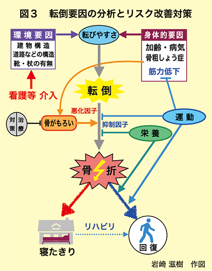 多くの要因が重なりあって転倒転落、骨折になるわけですが、その要因として大きくは環境要因と身体的要因とにわかれます(図3参照)。