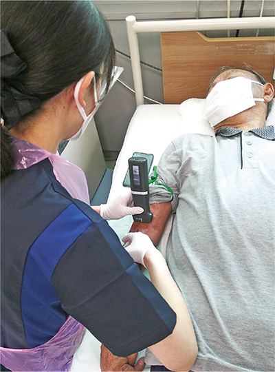 機器の取り扱いやエコー下穿刺の手技については、「血管モデル」と呼ばれるさまざまな患者さまの血管を想定して作られた模型を用いて練習を行います(図1)。模型を用いた練習を何度も繰り返し行い、手技が定着したと判断された後、指導者立ちあいのもと、実際に患者さまにエコー下穿刺を行います(図2)。エコー下穿刺を実施した後は、手技の上達に向けた改善点についてフィードバックを行います。