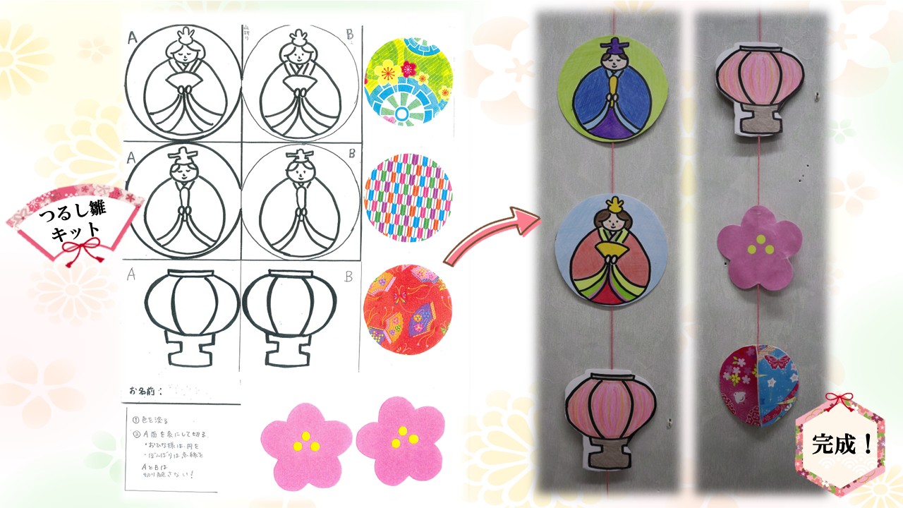 これまでにも毎年、さまざまな雛飾りを作ってきましたが、つるし雛の制作は今回が初めての試みです。職員が用意したキットを使い、「塗る・切る・貼る」といった簡単な工程で、どなたでも楽しみながら制作いただけます。
