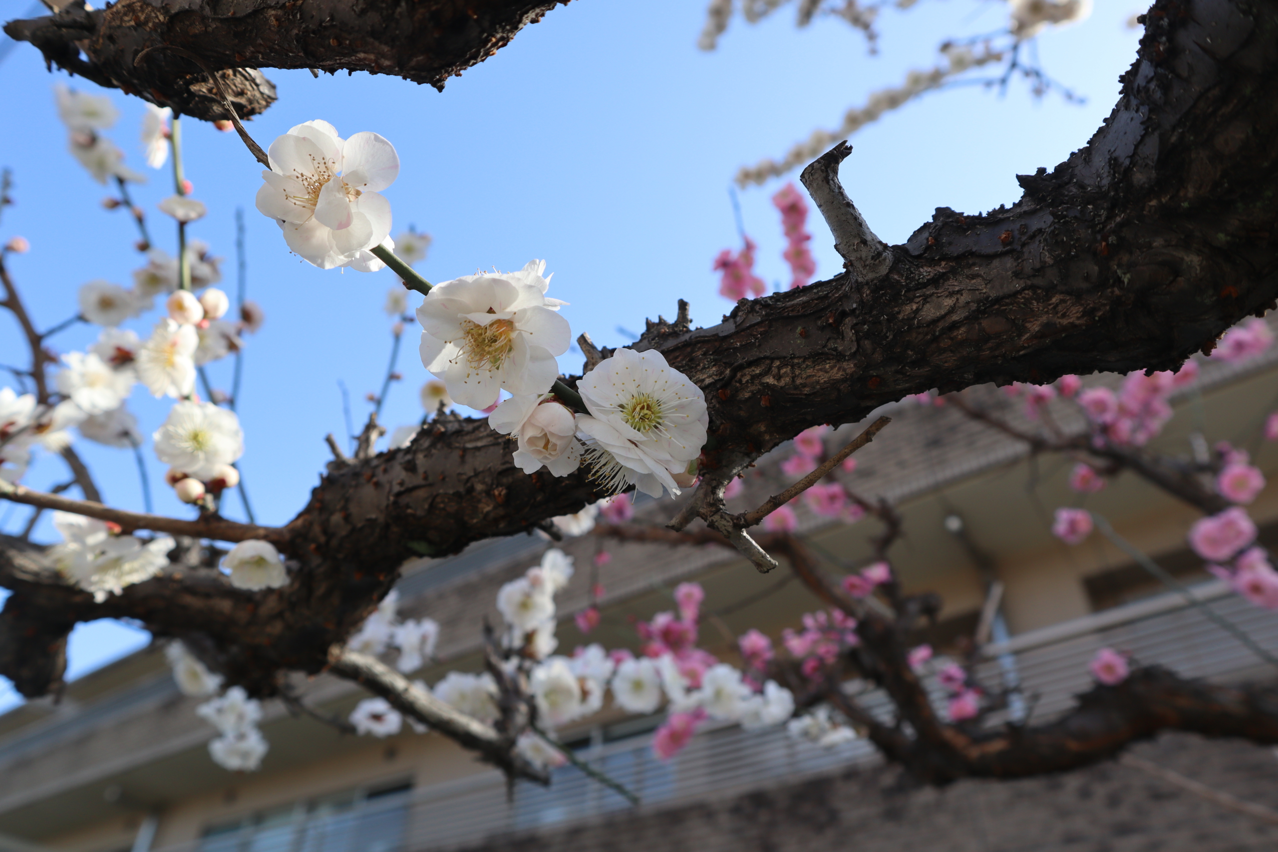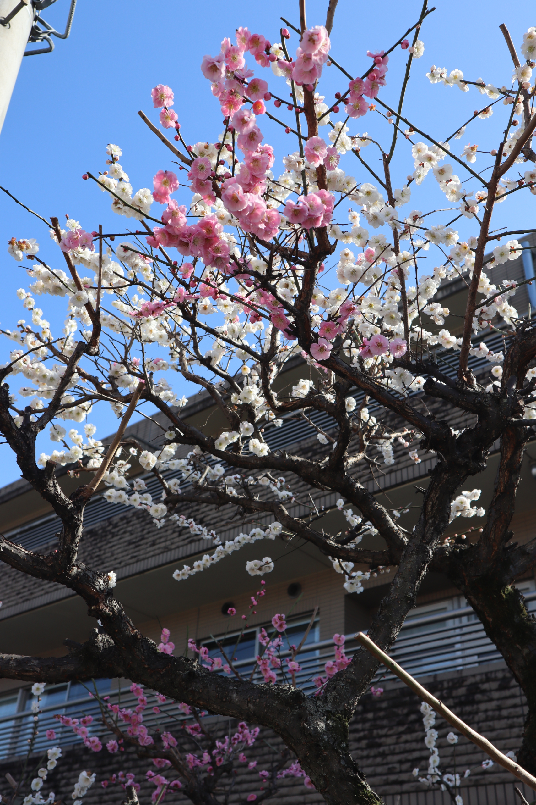 この梅の木は「源平梅」という品種で、1本の木から紅白2色の花が咲く、ちょっと珍しい梅です。紅白のコントラストがとても華やかで、まるで春の訪れを祝っているかのような美しさです。