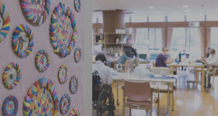 2階は主に認知症のご利用者さまの居室です。3階よりも明るめのナチュラルな木目調の家具で統一されています。フロアは「藤」「梅」に区分けされ、家具や壁の絵画もそれぞれのテーマーカラーに合ったものを配置しています。また、認知症のご利用者さまがストレスなく、なおかつ、安全に日常生活を過ごせるように配慮しています。