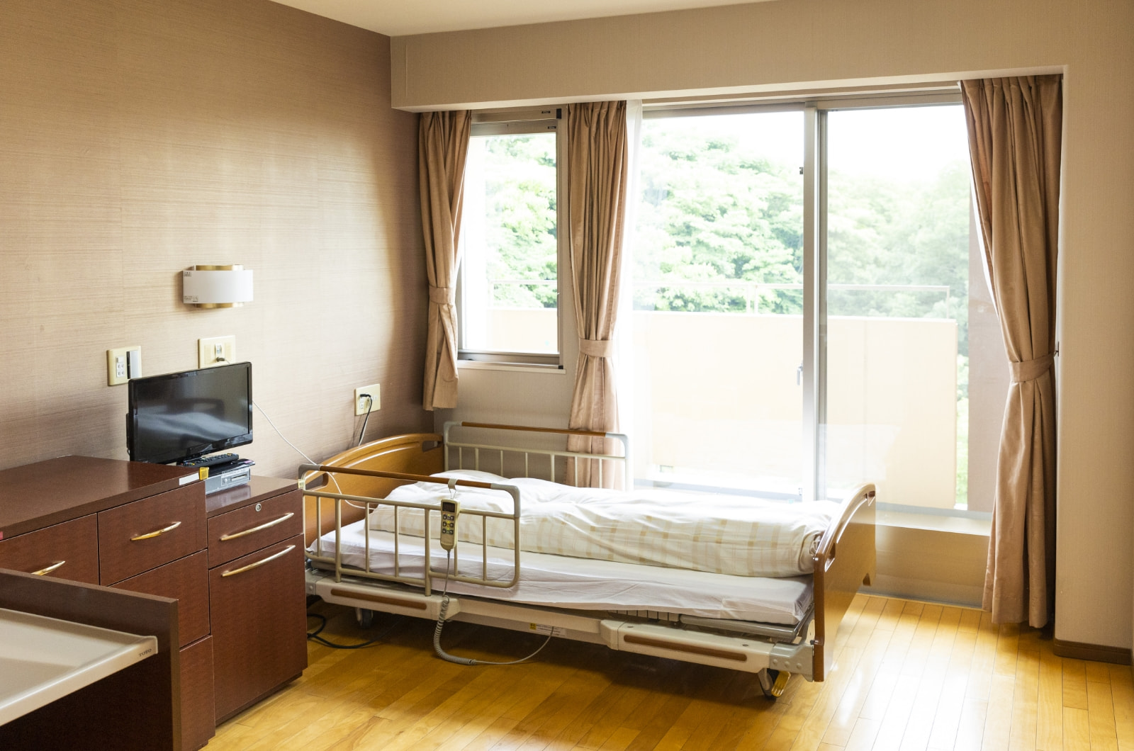 3階は主に一般棟居室です。チェストや床頭台、備え付けの棚はすべてダークブラウンで統一され、落ち着いた木材のフローリングは、ご利用者さまが滑りにくいように工夫されています。フロアのスペースは3つのカラーでテーマ毎に「桜」「花水木」「椿」という名前の居室空間に分けられ、変化をかもしだすとともに、ご利用者さまがご自身の居室を間違えることの無いように目印の役割にもなっています。